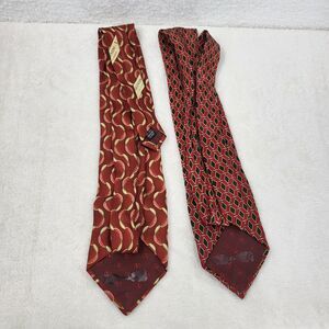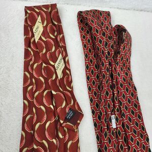The product is a lot of 2 men's silk ties by the brand Valentino. These ties feature a geometric pattern in multicolor, with a retro abstract theme. The ties are classic in size and style, with a pointed design. Made from high-quality silk, they are perfect for adding a touch of sophistication to any formal outfit.