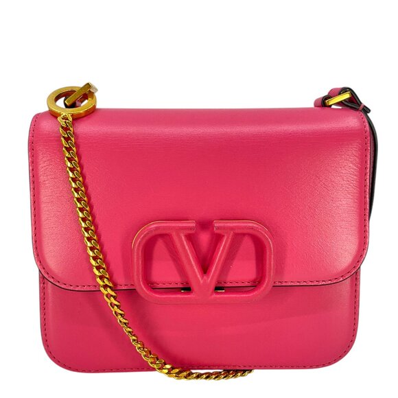 We guarantee the authenticity of this current, in-stores now VALENTINO Calfskin Leather VSLING Small Shoulder Bag crafted from black leather and gold-tone hardware. Featuring the house's signature V logo at front and a chain link and leather shoulder strap.