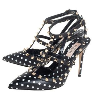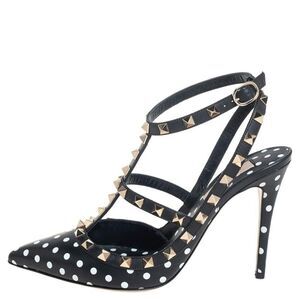 VALENTINO GARAVANI Black Ankle Strap Rockstud White Polkadot Sandals Siz…