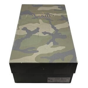 These edgy sneakers have grey suede, white leather and canvas camouflage print with white rockstuds around heel. These are sneakers sure to please, from Valentino.
