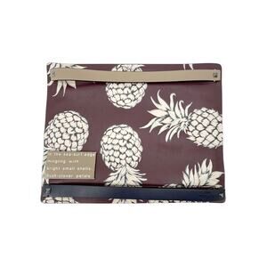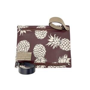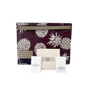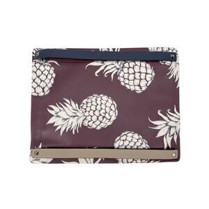 Colorful straps add contrast to a tropical pineapple print that adorns this leather clutch. This clutch is embellished with signature silver pyramid studs, and leather wrist straps.