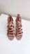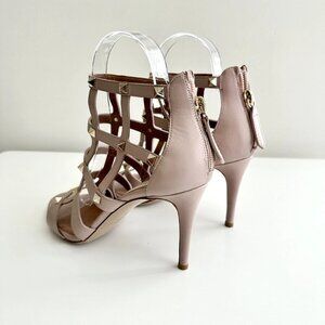 Details: rich taupe shade, caged design w/pale goldtone pyramid studs, back ankle zip closure w/leather pull, brown leather insoles w/stitched designer patch, open toe,