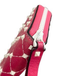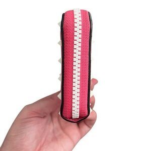 Stunning bright pink leather zip around wallet with white studs, stitching and zipper accents. Inside is a combination of red and pink. Very roomie - 12 card slots, zipper commitment, extra middle compartment for all of your needs.