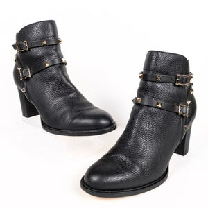 VALENTINO Garavani Black Rockstud Grainy Calfskin Heeled Moto Boot 70mm EU 40.5