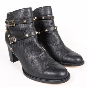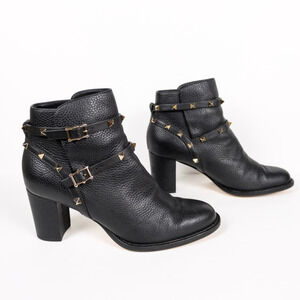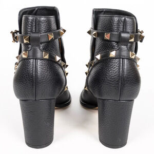 Black grainy leather heeled moto style ankle bootie with gold-toned rockstud details by Valentino Garavani. Block heel is 70mm (3"). Ankle straps are adjustable. COA included in photos.