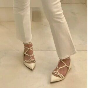 This adorable pair of Eyelet-Embellished Leather ballet flats from Valentino features a two-tone neutral palette. Pointed toe, silver-tone eyelet embellishments, a buckle fastening on the ankle straps, and leather-lined insoles. The comfortable shoe can be teamed up with office as well as casual attire.