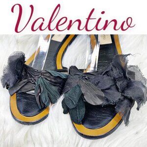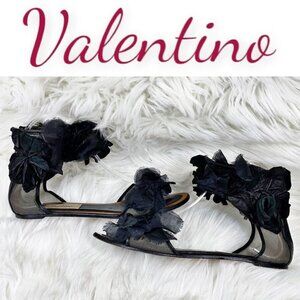 VALENTINO Leather, Mesh & Chiffon Embellished Flat Sandals, Size 38