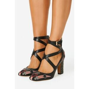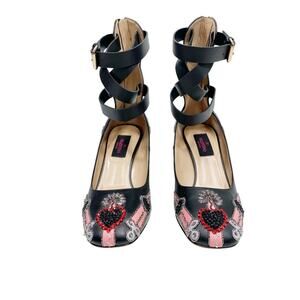 The Valentino Love Blade Black Leather Crystal Beaded Heart Ankle Wrap Heels deliver bold detail and luxury craftsmanship. Crafted from smooth black leather, these statement heels feature crystal studded and beaded heart embellishments with pink and silver accents, a block heel adorned with stud detailing, and wraparound ankle straps with adjustable buckles for a striking finish.
