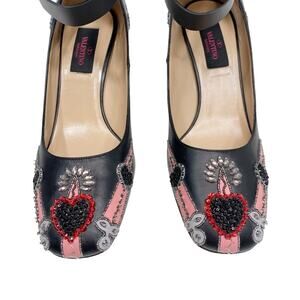 tags: limited edition, rare, valentines, galentines, statement, high end, designer, edgy, Valentino Love Blade heels, crystal beaded Valentino shoes, black leather ankle wrap heels, studded block heel designer shoes, Italian-made Valentino footwear, luxury statement heart heels, pink and silver beaded shoes, runway-level Valentino style, collectible Valentino ankle strap shoes, bold embellished Valentino heels, party-ready designer footwear, romantic motif Valentino shoes, high-fashion block heel sandals.