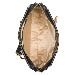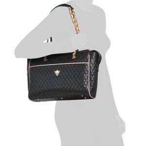 dual carry chain handles, gold tone brand logo hardware, quilted design, metal feet