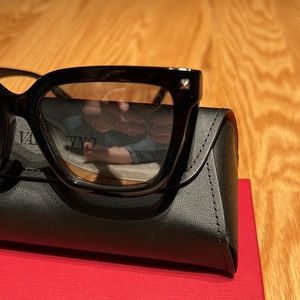 Black acetate sunglasses model VA4084F has an elegant oversized squared frame with gray mirrored lenses. The raised corners are highlighted by an iconic metal stud, which lightens the frame in a sophisticated way. The sinuous temples, finished with the Valentino stud, contribute to the model's vintage charm while the VLTN logo signs the left temple.