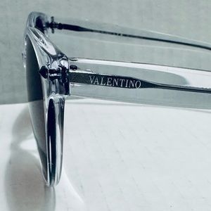Authentic like new condition Valentino sunglasses with clear acetate frames and red lens. Signature rockstud detail at eyes and arms by ears. Measurements: 56-18-145. Style VA4087D.