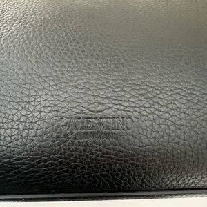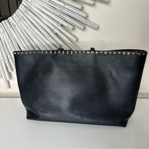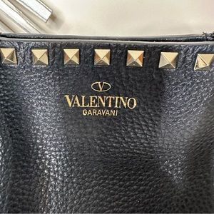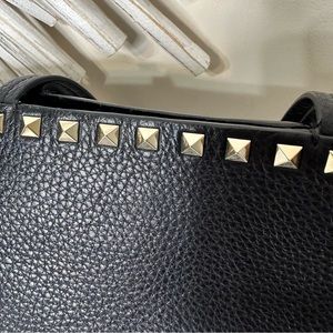 This Authentic Valentino Rockstud Tote is in amazing condition with little wear to it. It has black pebbled leather with its iconic rockstuds around the edge of the handbag. The interior has no wear. The exterior has one small white mark but isn't noticeable unless you are up close (refer to photos)