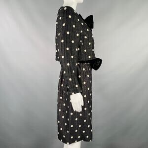 NIGHT by VALENTINO dress & jacket set in a black and white polka dot fabric and includes a collarless bow cropped jacket with snap & button closure and matching strapless lace dress with side zipper closure. Made in Italy.