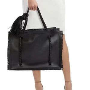 A beautiful luxe and spacious tote framed with eye-catching fringe and topped with twist-rope tassels. Features double rope rolled top handles with tassel detail. Straps can also be converted for cross-body wear.