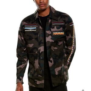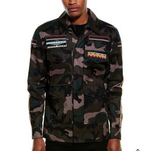 - Design Details: Military Jacket in Army Camo with beaded trim, three chest pockets, two front pockets, and snap cuffs.