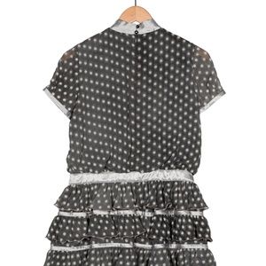 Charcoal grey and silver ValMax dress with tie accent at neck, short sleeves, polka dot print overlay and concealed zip closure at back. Hand wash only.