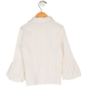 White and Cream ValMax striped top with Peter pan collar, long sleeves, tie closure at neck and button closures at front.
