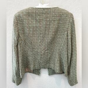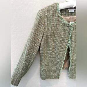 Tags tweed jacket, green tweed blazer, fringe trim, Chanel inspired, office wear, business casual, career jacket, lined blazer, textured jacket, large jacket, olive moss jacket, NWT blazer, layering piece