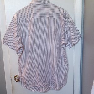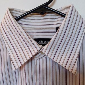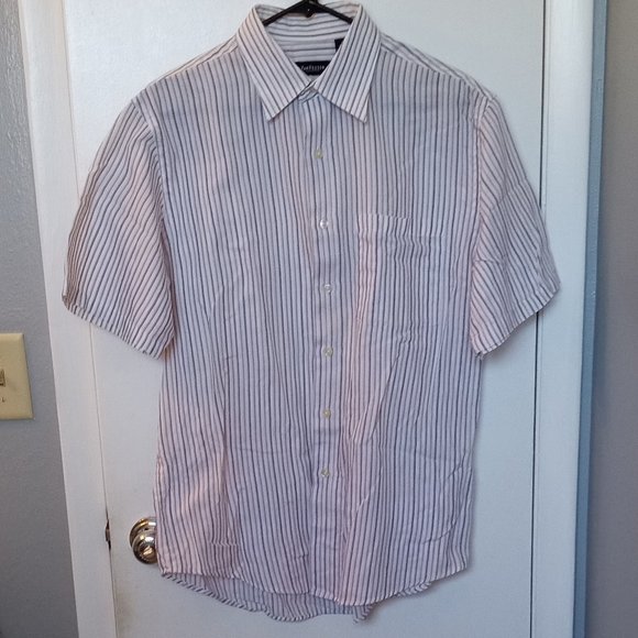 Almost new Van Heusen mens shirt is a medium, neck size 15" - 15.5". It is made of 65% polyester and 35% cotton. The shirt has dark brown and tan stripes running in between white blocks of fabric. It has 7 buttons down the front, 1 on each side of the collar, and 2 extra buttons sewn into the inside of the front panel. It has 1 pocket on the left side, and is short sleeved. The chest measures 23 1/4" across from underarm seam to underarm seam. The sleeve measures 10 1/4" from the shoulder seam to the end of the arm opening. The bottom of the sleeve measures 5 3/4" from the underarm to the end of the arm opening. The arm opening measures 8 1/4" from the crease (from the top to the seam at the other end.) It is not measured all around the opening.