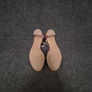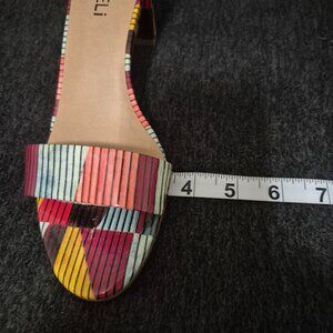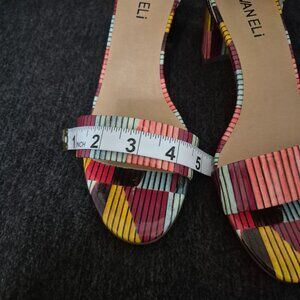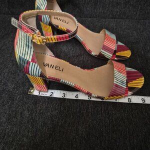Vaneli Meres multicolor leather ankle sandals, size 7M. Multicolored leather upper with rubber sole and 2.5" block heel. Multicolor design will complement any outfit. Pre-owned, in almost new condition.