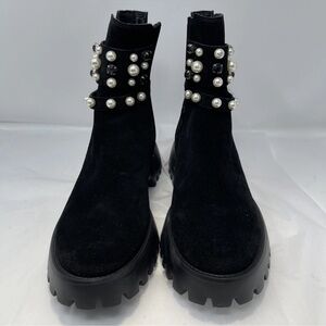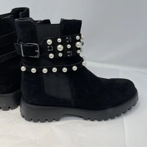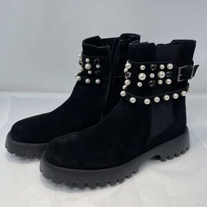 Step out in style with these chic black boots, featuring elegant pearl embellishments. Perfect for adding a touch of sophistication to any outfit.