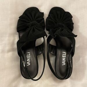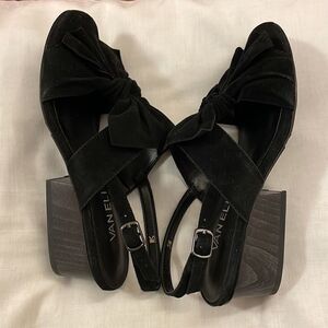 VANELI BLACK SUEDE SANDALS. NEW. STYLE NAME IS CAMEY. BEAUTIFULLY PADDED SANDALS. BOW MOTIF IN THE FRONT OF EACH SANDAL. HEELS ARE SLIGHTLY SET IN AND HAVE A “WOOD” LOOK.