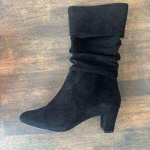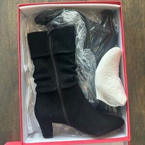 Highlighted by a trend-forward slouched silhouette. the Delsie boot by Vaneli is a perfect addition to your chilly weather wardrobe. The suede construction brings a soft touch, and the classic look proves versatile.