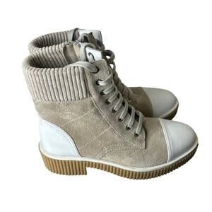 VANELi Mage Lace Up Combat Boots in Light Grey Nival Combo. Size 7. Features round toe, suede and leather upper, rubber outsole, ribbed panel, front lace-up, and side zipper closure. Excellent pre-owned condition.