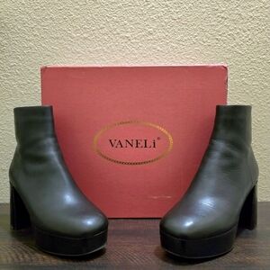 Step into sleek style and comfort with these black leather ankle boots by Vaneli. Made from genuine leather with a block heel and easy side zipper, they’re perfect for everything from office looks to weekend wear. Light try-on wear only; otherwise in excellent condition.