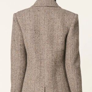 Beautiful classic wool blazer from Vanessa Bruno, it is woven with an elegant herringbone pattern in brownish shades. Perfect fit and exclusive expression, for both everyday and informal occasions. The jacket has lapels, a slit in the back and it closes with a single button. The blazer has pockets with flaps and is fully lined. The sleeves are slim and are nicely finished with three buttons.