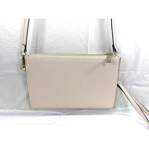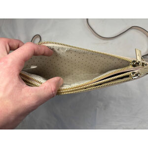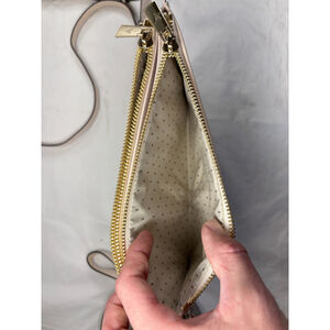 The off-white creamy faux leather exterior is accented with gold hardware, giving it a designer look.