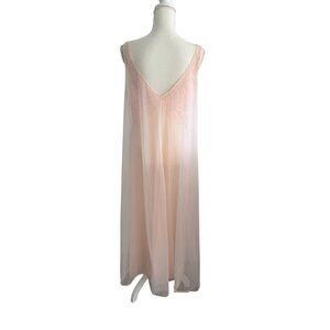 Indulge in vintage elegance with this Vanity Fair nightgown. Featuring a beautiful peach pink lace, double-layer nylon design, and delicate details, it promises both comfort and style. Perfect for adding a touch of class to your sleepwear collection. Good vintage condition with small restitch on left hand side from a tear.