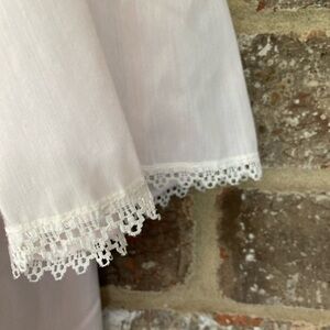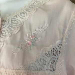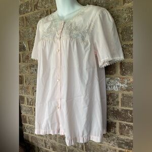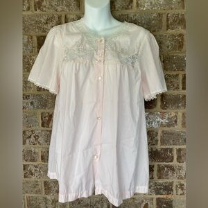 Vintage Vanity Fair embroidered button down pink night shirt pajama top. Armpits armpit measures 18 inches. Shoulder to hemline 26 inches. 42% polyester 36% nylon 22% cotton. Machine wash. Gently preowned condition with no flaws.