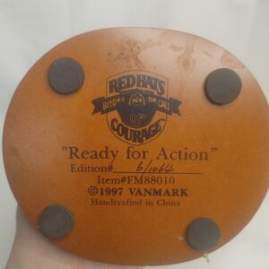 This VANMARK "Ready for Action" firefighter figurine, Item #FM88010, Edition #6/1066, depicts a male figure in a yellow coat with brown accents, black boots, and a black helmet marked "No 1." He holds a hose nozzle and a breathing apparatus, with an oxygen tank on his back. The figurine stands approximately 9 inches tall on a textured grey base, which rests on a round wooden platform. Original tags are attached, indicating a 1997 VANMARK copyright and "Handcrafted in China." No visible imperfections are present.