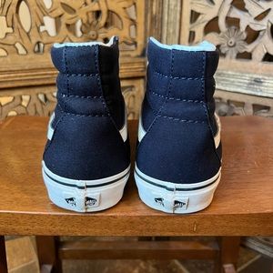 Excellent condition Vans classic high tops. Bottom soles are in perfect condition! There is some slight scuffing on the sides of the soles, but otherwise these are a great find. These show up a bit darker in these photos, but they are navy, not black.