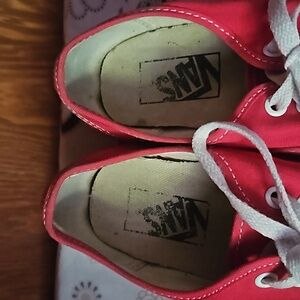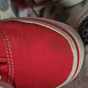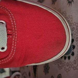 USED no box UNISEX Sz4 (mens) Sz5.5 (womens) color RED classic tie up VANS. Please reference pictures really carefully. slight distress on left shoe near tag. Some staining in toe box which can be washed off amd cleaned. Condition is 7/10