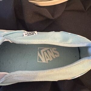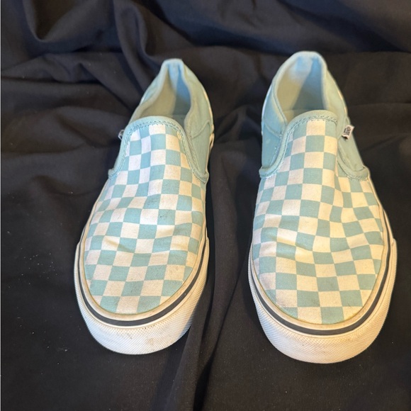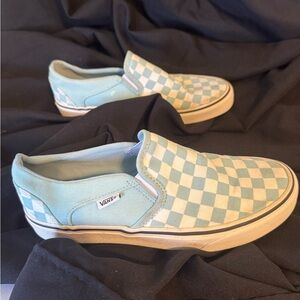Women’s VANS slip-on sneakers with a checkerboard pattern. Light blue and white canvas upper. Elastic side accents for easy wear. White rubber sole with some scuffs. Size 8 1/2.