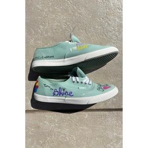 This pair of Vans—though Authentic as seen by the VANS tags located on each exterior side of the shoes have been artistically and beautifully improved by the original owner. This artist’s signature per’se is located on the left shoe—right side heel area.