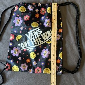 Vans drawstring backpack with floral and smiley design. Black base with purple, yellow, and pink details. flowers retro 70s