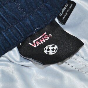 These Vans Blue Yin and Yang Boardshorts offer a modern take on classic surf style. They feature a dark blue color with a unique all-over print showing large round flowers. The center of each flower is a green and cream-colored yin and yang symbol. These boardshorts have an elastic waist with a drawcord. They ensure all-day comfort in and out of the water. Side seam pockets provide easy access. A back pocket with a zippered closure keeps items secure, and you will find additional Vans-branded details. Made from 100% polyester, these shorts offer sustainability. Donated new with tags, they are a fresh find. The waist tag has a markdown mark over the Vans logo (see photo). By purchasing this item, you're supporting Father Joe's Villages' mission to prevent and end homelessness in San Diego.
