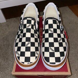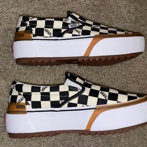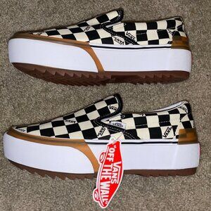 Step out in style with the limited edition Vans Checkerboard Stacked Slip-On Sneakers, as seen on Chelsea DeBoer. These classic slip-on shoes feature a checkered print and durable canvas upper, blending modern and retro elements. The stacked platform sole with translucent foxing adds a unique edge to your look.