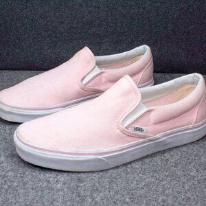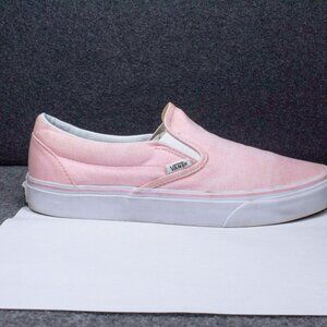 Preowned VANS Classic Slip-On Pink White Skateboard Sneakers Mens Size 8.5 Womens Size 10. In great condition with lots of life left. Canvas has minor creases and very small scuffs over from the sidewalls, sidewalls scuffed in some places but no heel wear and clean, inside soles faded but also clean, bottom soles have excellent tread with only flaw of some sharpie written on. Overall perfect pair of Vans slip ons for errands or running around town. Please see photos, FAST shipping.