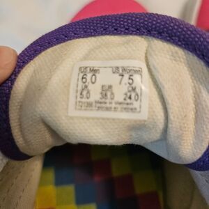 The shoes feature blocks of bright colors, including pink, blue, yellow, green, and purple. They have a classic white rubber banding around the show, a white side stripe, yellow soles and white laces. These carry a true retro, playful look that make a bold fashion statement with their eye-catching color combination.