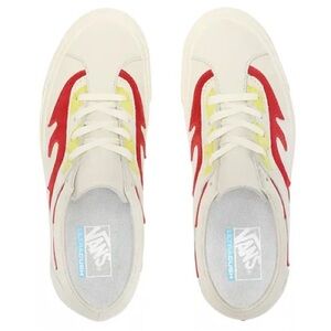 VANS Stylish cream sneakers featuring a bold red and yellow flame design. Perfect for a standout look.