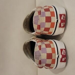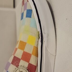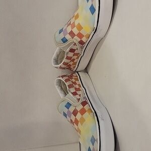 Vans multicolored slip on skateboard sneakers. The sneakers have 2 areas at the toe area that s not perfect (see pictures) They are not perfect, but there is a lot of wear left in the sneakers. Please see all pictures.