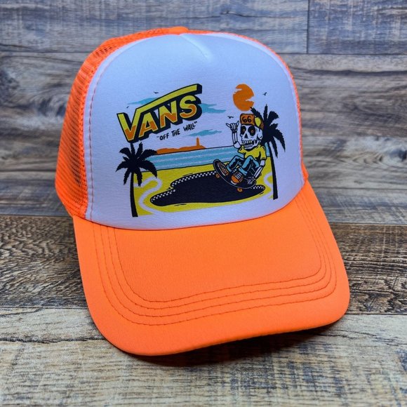 VANS Mens Trucker Hat Orange Snapback Beach Skeleton Retro Skateboard Logo Cap