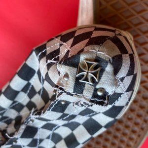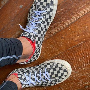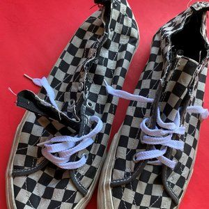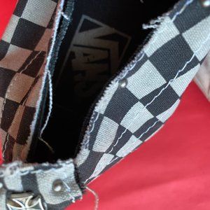 Great VANS Off the Wall checkerboard black and white raw edge can't find the size but they fit me tight my size is 11 so these are 9-10 sole is 11 1/4 no stains fading tears
