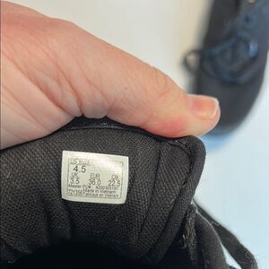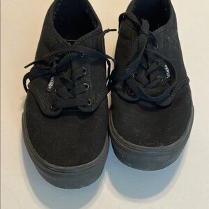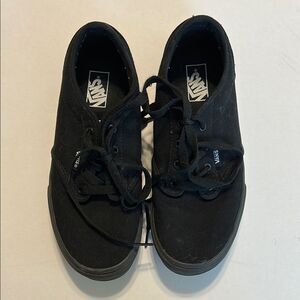 Size 4.5 youth black Vans Off the Wall canvas lace-up skateboarding sneakers. Experience the perfect blend of style and comfort with Vans Black Canvas Skate Sneakers. These all-black sneakers feature a durable canvas upper, flat sole, and minimalist design, making them ideal for both skateboarding and casual wear.