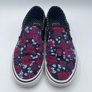 Vans slip-on sneakers with a vibrant floral design. Features red and blue flowers on a black background. (1600)